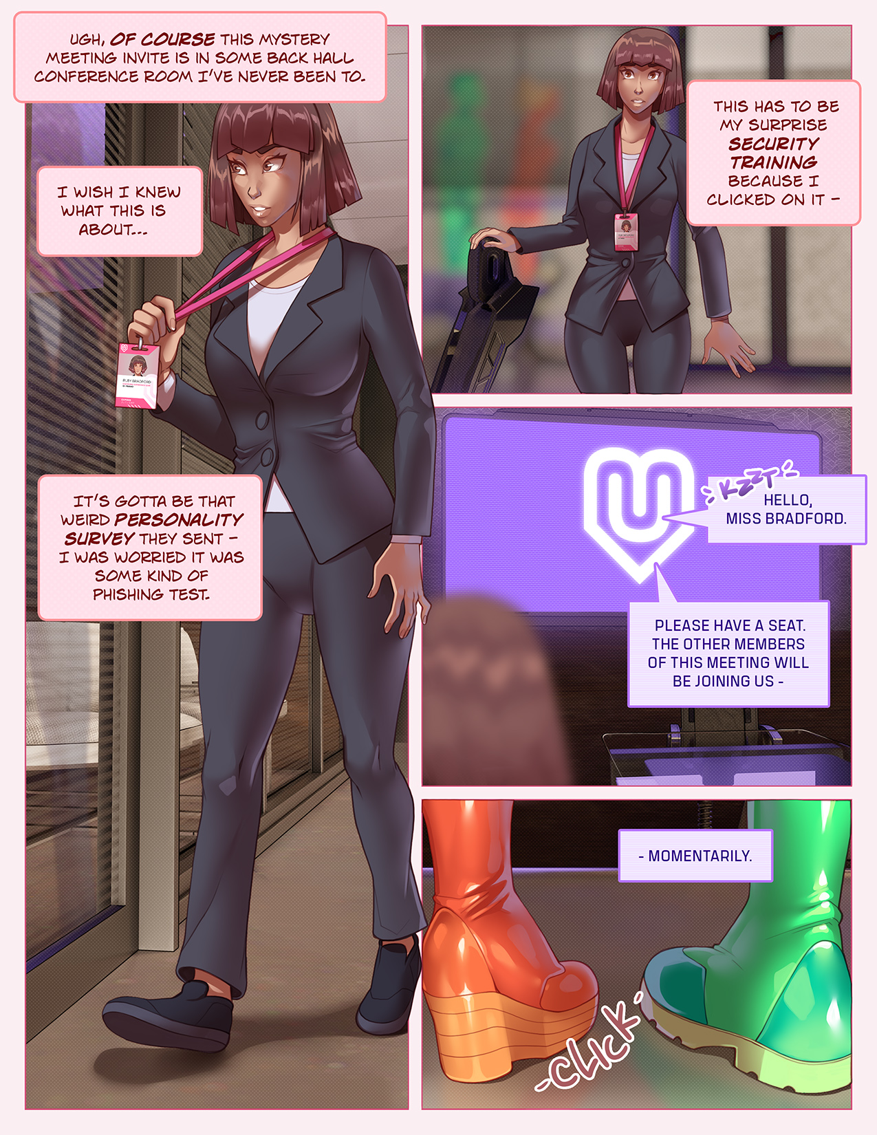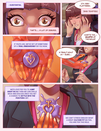 Of course, because this is an Angrboda comic, the onboarding for her new role involves learning about the Eros sexdoll's features by becoming one herself. Luckily, she has two already-changed colleagues to help her try out all her new body's fancy technology, like her SensiStim(TM) synthetic skin, or the ModBody(TM) system which lets Eros units reshape their bodies on command.